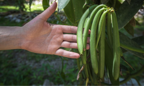Die Ernte der grünen Schoten findet ca. 9 Monate nach Bestäubung der Vanilleblüte statt. Die Frucht ähnelt grünen Bohnen. Sie sind geruchlos und müssen weiter gepflegt werden, um die charakteristische braune Farbe und das intensive Aroma zu erhalten.