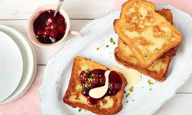 Für die Erdbeersoße Erdbeeren mit Zucker und Zitronensaft aufkochen. Vom Herd nehmen, mit dem Pürierstab pürieren und durch ein Sieb passieren.