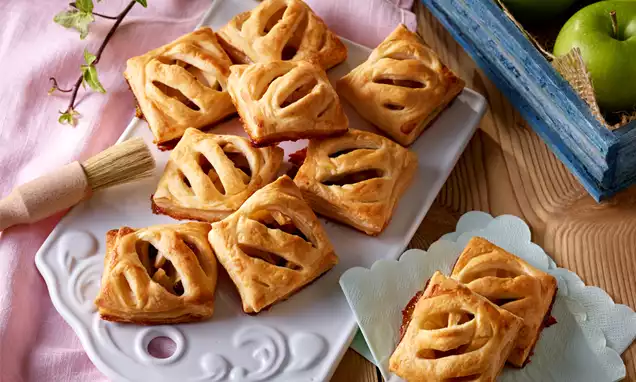 Den Teig auf einer bemehlten Arbeitsfläche ca. 2 mm dick ausrollen und Kreise (12 cm Ø) ausstechen. Die Füllung auf den vorderen Teil der Teigscheiben aufteilen und dabei einen Rand frei lassen. Die Ränder mit Milch bestreichen. Die hinteren Teighälften über der Apfelfüllung zu Taschen zusammenklappen und die Ränder gut andrücken.