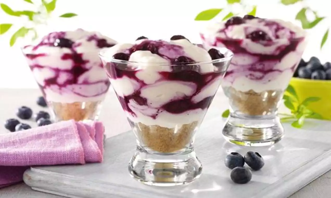 Die Creme in einen Spritzbeutel mit Lochtülle (12 mm Ø) füllen. Die erste Schicht Creme kreisförmig in kleinen Rosetten in die Gläser spritzen. Einen Teil der vorbereiteten Heidelbeeren mit einem Kaffeelöffel in die Zwischenräume geben. Den Vorgang wiederholen bis Creme und Heidelbeeren aufgebraucht sind.