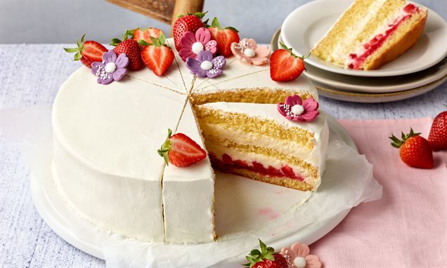 Schlagobers mit Sahnesteif aufschlagen. Die Torte damit einstreichen und mit Erdbeeren und Marzipanblüten verzieren.