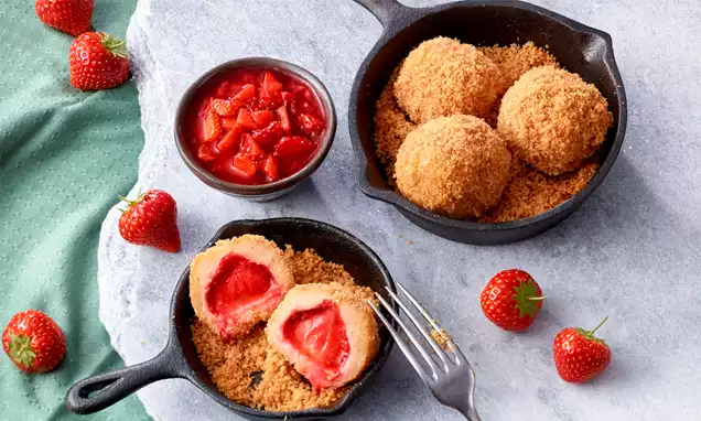 Das Eis ca. 15 Min. vor dem Servieren aus dem Tiefkühler nehmen. Das Eis portionieren und mit Erdbeeren dekorieren.