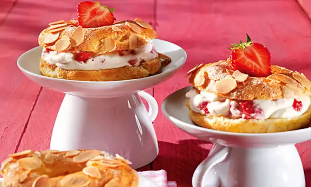 Den erkalteten Tortenboden gerade schneiden und mit Marmelade bestreichen. Die Erdbeeren darauf verteilen.