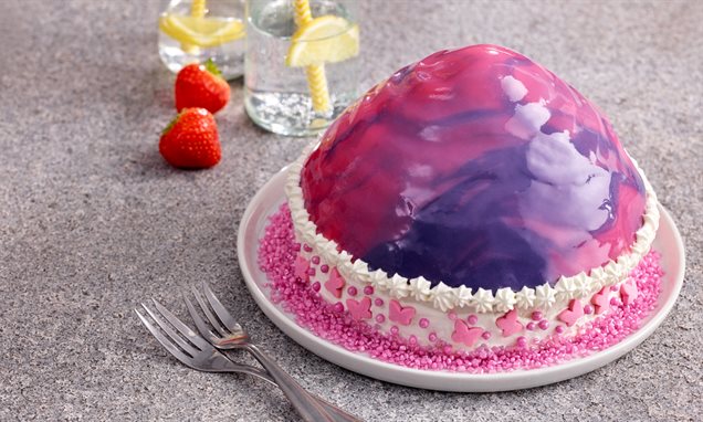 Für die Glasur Gelatine mit Wasser verrühren und ca. 5 Min. stehen lassen. Zucker mit Wasser und Kondensmilch unter Rühren bei mittlerer Hitze aufkochen und 2 Min. köcheln lassen. Vom Herd nehmen und die Schokolade einrühren. Die Gelatine einrühren. Die Glasur in 1/3 und 2/3 aufteilen, jeweils rot und lila einfärben und auf 35 Grad abkühlen lassen; dabei ab und zu vorsichtig umrühren (es sollen keine Luftbläschen entstehen).