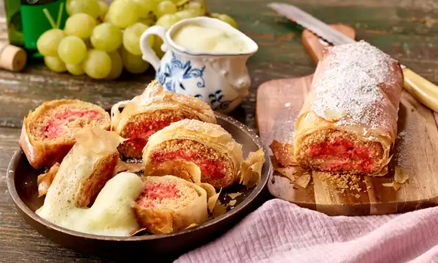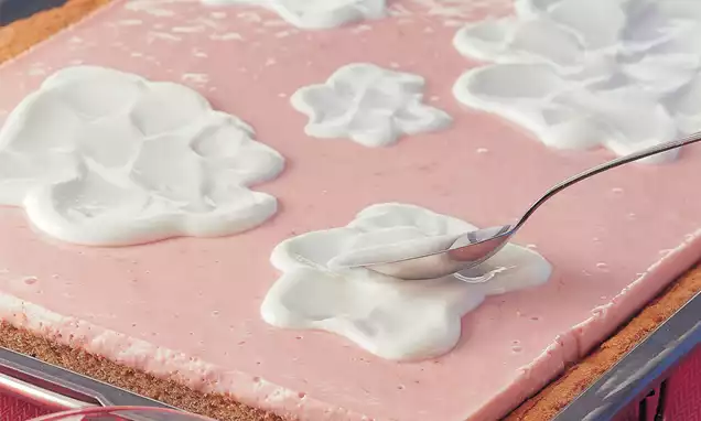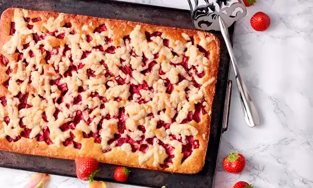 Fruchtiger Blechkuchen mit Puddingcreme und Erdbeeren