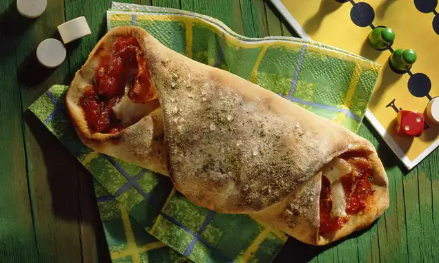 Den Teig entrollen und eine Hälfte dünn mit Wasser bestreichen. Die nicht bestrichene Teighälfte darüberklappen.