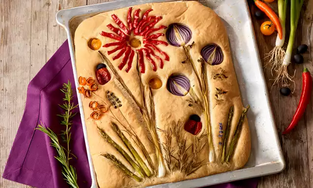 Den Teig auf ein mit Backpapier ausgelegtes Backblech legen und mit einem Kochlöffel im Abstand von ca. 5 cm Löcher in den Teig drücken.
