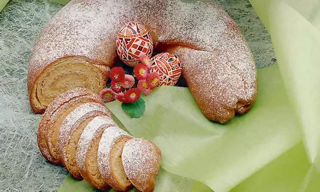 Vom erkalteten Kuchen an den 2 Längsseiten jeweils soviel abschneiden, dass ein Gespenst entsteht. Die Abschnitte umgedreht an den Körper legen, dass sie wie 2 in die Luft gestreckte Arme aussehen. Den Kuchen mit Creme bestreichen und kalt stellen.