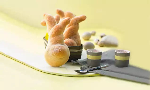 Den Teig auf einer bemehlten Arbeitsfläche zusammenstoßen (flach drücken und von links und rechts zur Mitte hin einschlagen), in drei gleiche Stücke teilen und rund formen. Die Teigstücke 20 Min. rasten lassen, zu Rollen formen und zu einem Zopf flechten.