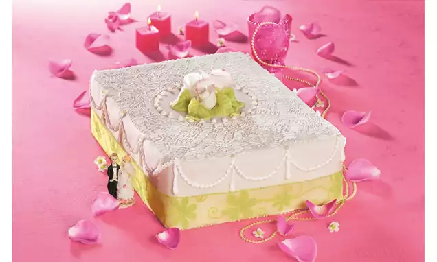 Schlagobers mit Staubzucker und Sahnesteif aufschlagen. Den Tortenrand damit einstreichen und mit einer Zackenteigkarte ein Muster ziehen. Auf der Torte 16 Stücke markieren.