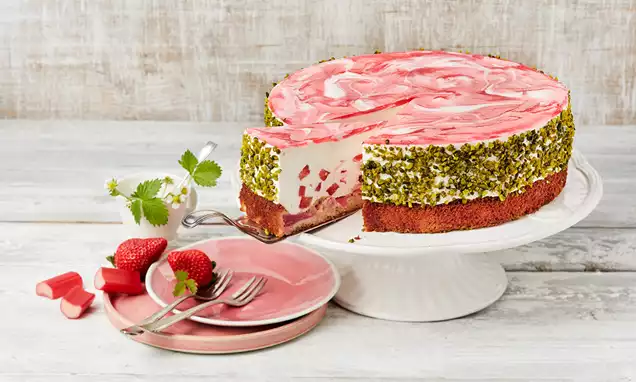 Die erkaltete Torte einmal durchschneiden. Den Tortenboden auf eine Kuchenplatte stellen und mit dem gereinigten Springformrand umstellen.