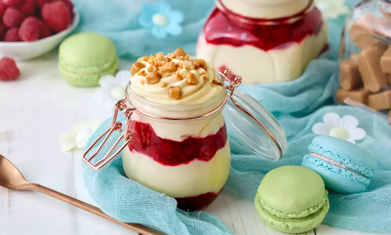 Die aufgetaute Frucht-Einlage vorsichtig durchmischen und die Hälfte auf die Gläser aufteilen. Die Creme in einen Spritzbeutel mit beliebiger Tülle füllen und die Hälfte in die Gläser spritzen. Den Vorgang wiederholen.