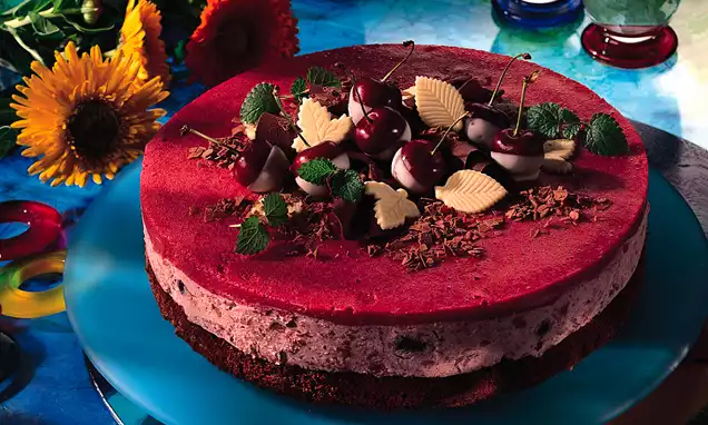 Die Sauerkirschen auf einem Sieb abtropfen lassen und die Flüssigkeit dabei auffangen. Puddingpulver mit Zucker vermischen und nach und nach mit 5 EL vom Kompottsaft glatt rühren. Übrigen Kompottsaft aufkochen. Vom Herd nehmen, angerührtes Pulver mit einem Schneebesen einrühren, zurück auf den Herd stellen und zu einem Pudding kochen. Sauerkirschen und gefrorene Himbeeren unterrühren und abkühlen lassen. Die Füllung auf dem vorgebackenen Kuchenboden verteilen.