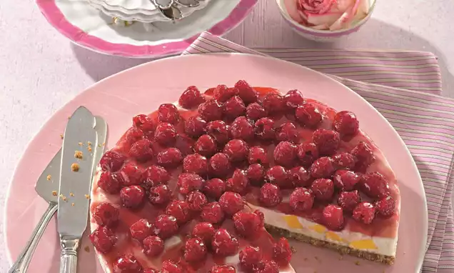 Für die rote Füllung die Götterspeise über Dampf (Wasserbad) oder in der Mikrowelle kurz erwärmen. 1/3 der Creme mit flüssiger Götterspeise und Rote Grütze verrühren.
