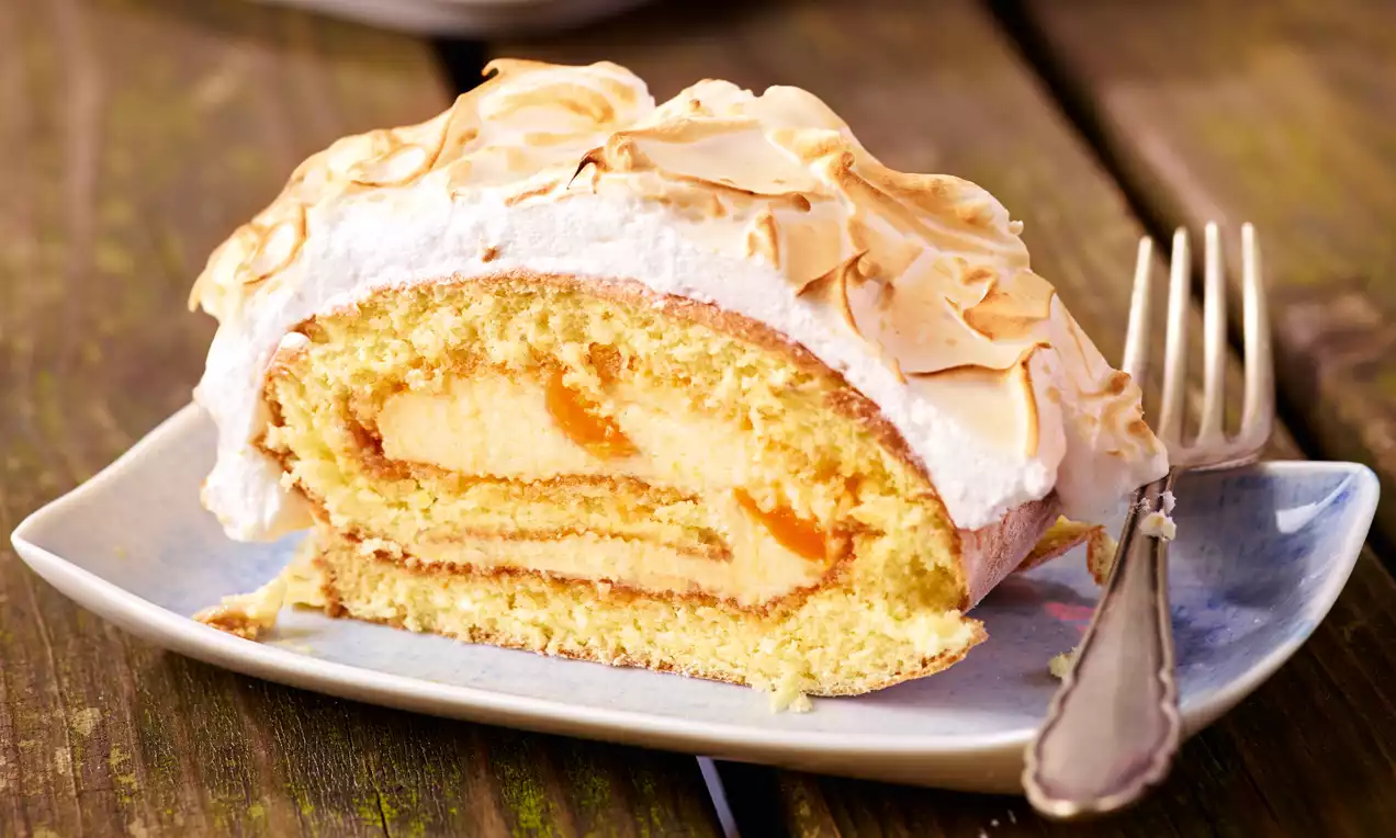 Eiklar mit Zucker aufschlagen und auf die Roulade streichen. Mit der Palette oder einem Löffel den Eischnee etwas in die Höhe ziehen.