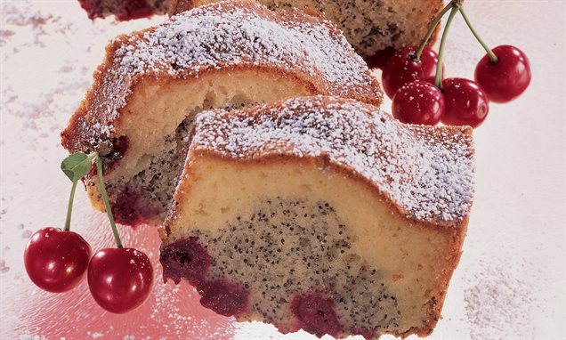 In die übrige Masse Mohn und Apfelraspeln einrühren und auf der Masse in der Kranzform gleichmäßig verstreichen. Die Kirschen darauf verteilen und etwas in den Teig drücken.