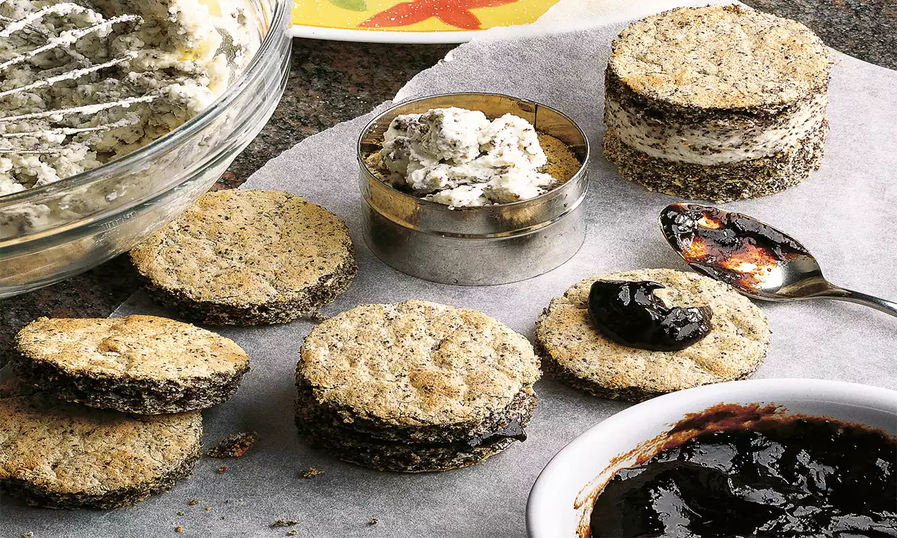 Die Törtchen mit einem Austecher (4 cm Ø) umstellen, und je etwas Füllung daraufgeben und mit den übrigen Biskuitscheiben abdecken. Die Scheiben leicht andrücken und aus dem Ausstecher nehmen.