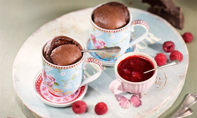Himbeeren mit Staubzucker verrühren und zum Mug-Cake servieren.