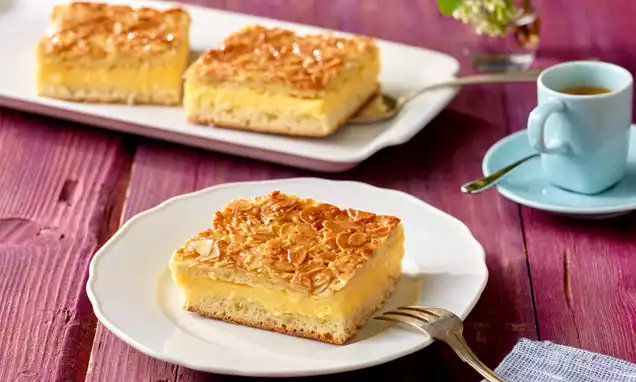 Für die Masse Eier mit Zucker und Vanillin-Zucker mit dem Handmixer (Rührstäbe) schaumig aufschlagen. Mehl mit Backpulver vermischen, darübersieben und mit den Mandeln mit dem Kochlöffel unterheben.