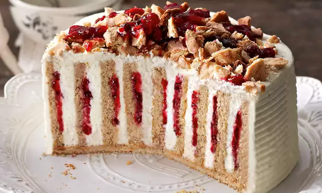 Den unteren Tortenboden auf eine Tortenplatte geben und mit 1/3 des Mandel-Obers bestreichen. Den mittleren Teil auflegen, leicht andrücken und die Hälfte des übrigen Mandel-Obers aufstreichen. Den oberen Tortenboden auflegen, leicht andrücken und das Herz mit dem übrigen Mandel-Obers einstreichen. Die Torte ca. 1 Stunde kalt stellen.