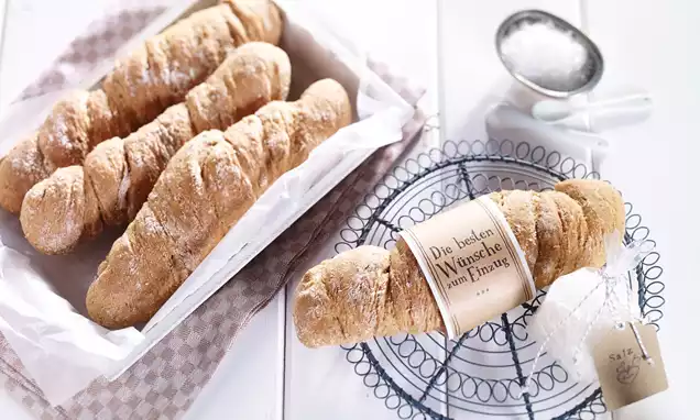 Die Teigstreifen um die Rollen wickeln. Die Rollen mit dem Schluss nach unten auf mit Backpapier ausgelegte Backbleche geben (Abb. 2). Die Holzspieße durch die Füllung schieben, bis die Spitze oben ca. 3 cm herausschaut.