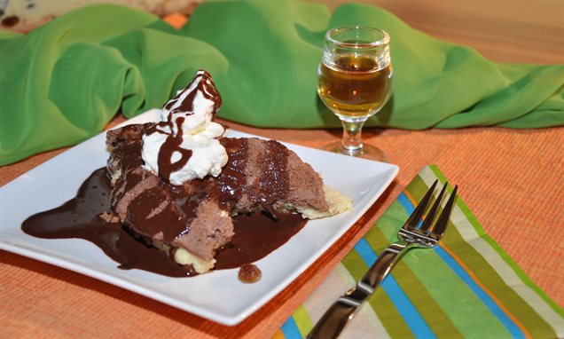 Für die Soße Schokolade mit Kakao, Zucker und Wasser unter Rühren aufkochen. Vom Herd nehmen und Rum und Honig einrühren.