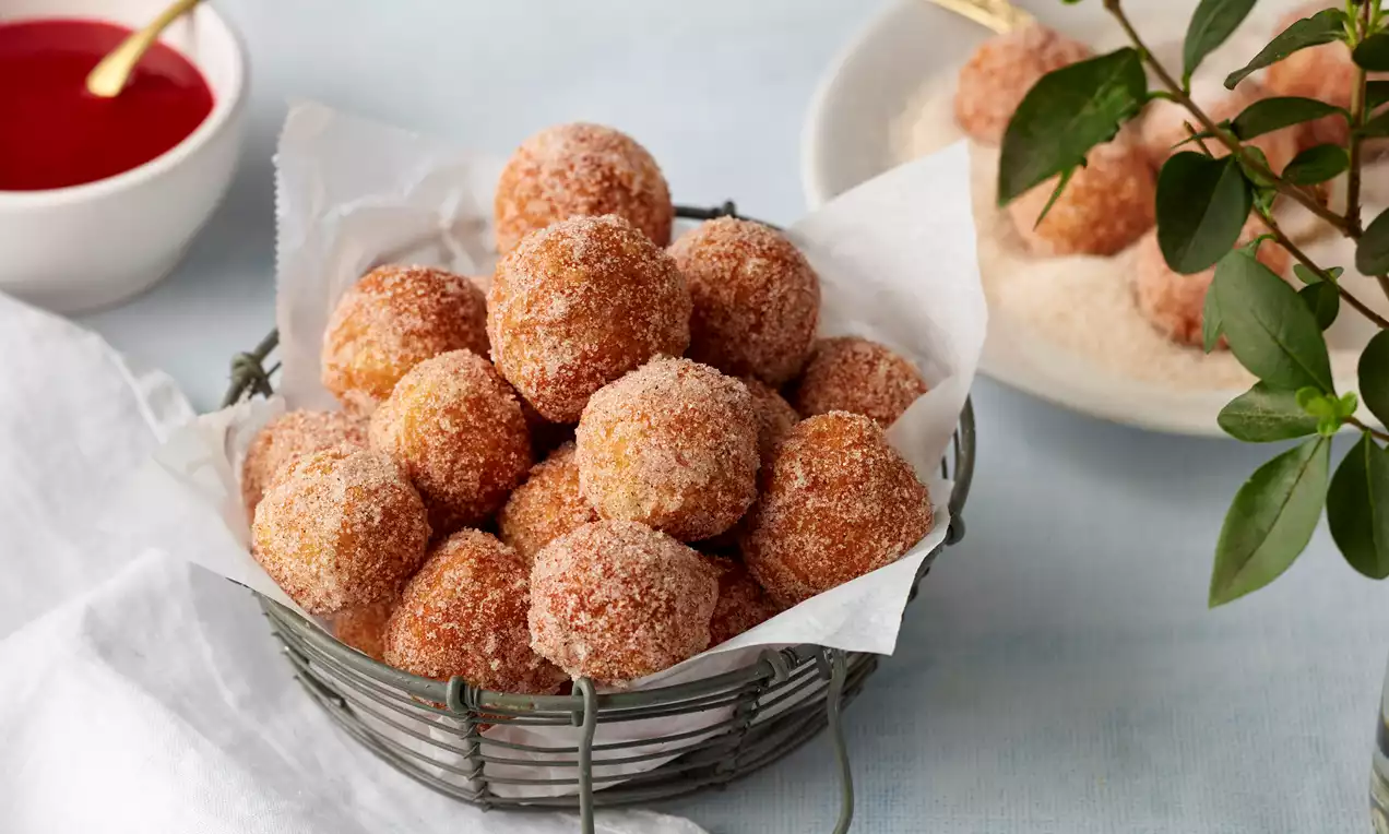 Zucker und Zimt vermischen und die noch heißen Bällchen darin wälzen.