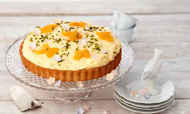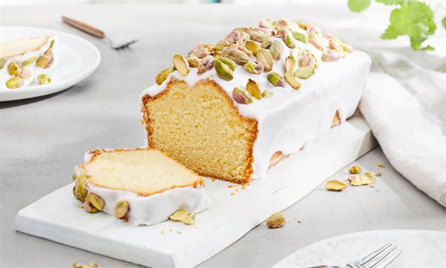 Für den Guss Puderzucker mit Zitronensaft zu dickflüssiger Konsistenz glatt rühren und auf den Kuchen streichen. Vor dem Festwerden mit Pistazien bestreuen.