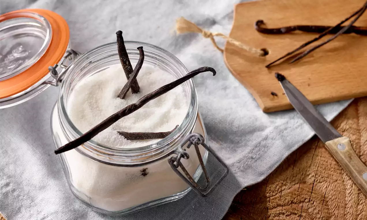 Den Zucker auf 2 verschließbare Gläser (á 250 ml) aufteilen. Die Vanilleschoten aufschneiden und in den Zucker stecken. Die Gläser verschließen, gut schütteln und einige Wochen zum Aromatisieren stehen lassen. Die Gläser zwischendurch aufschütteln.