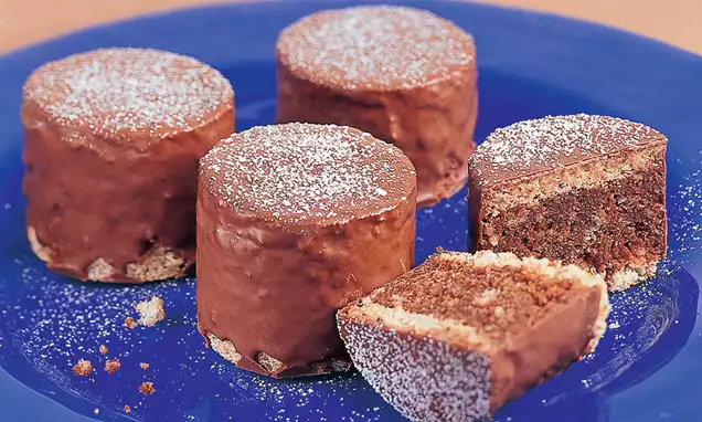 Das erkaltete Biskuit stürzen und das Backpapier abziehen. Die Biskuitplatte längs in 8 x 5 cm breite Streifen schneiden, aber zusammenlassen.